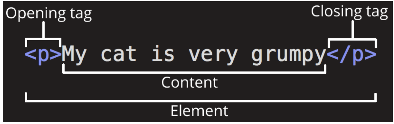 여는 태그(Opening tag): 이것은 요소의 이름과(이 경우 p), 열고 닫는 꺽쇠 괄호로 구성됩니다. 요소가 시작(이 경우 단락의 시작 부분)부터 효과가 적용되기 시작합니다.